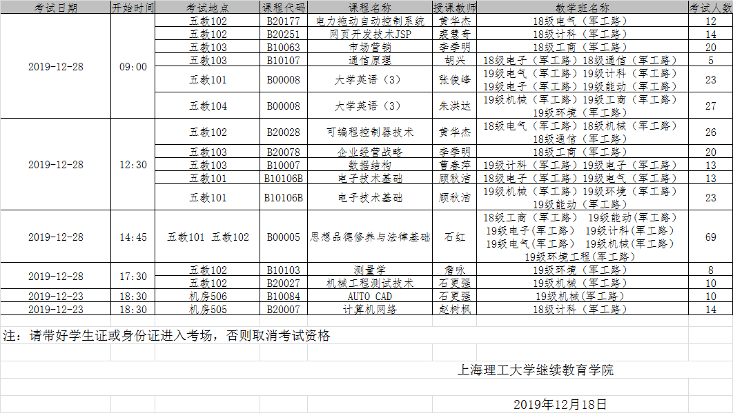 【摘要】上海理工大學繼續教育2019年秋季18周考試安排(軍工路校區) 屆時請同學們準時參加考試!!!...